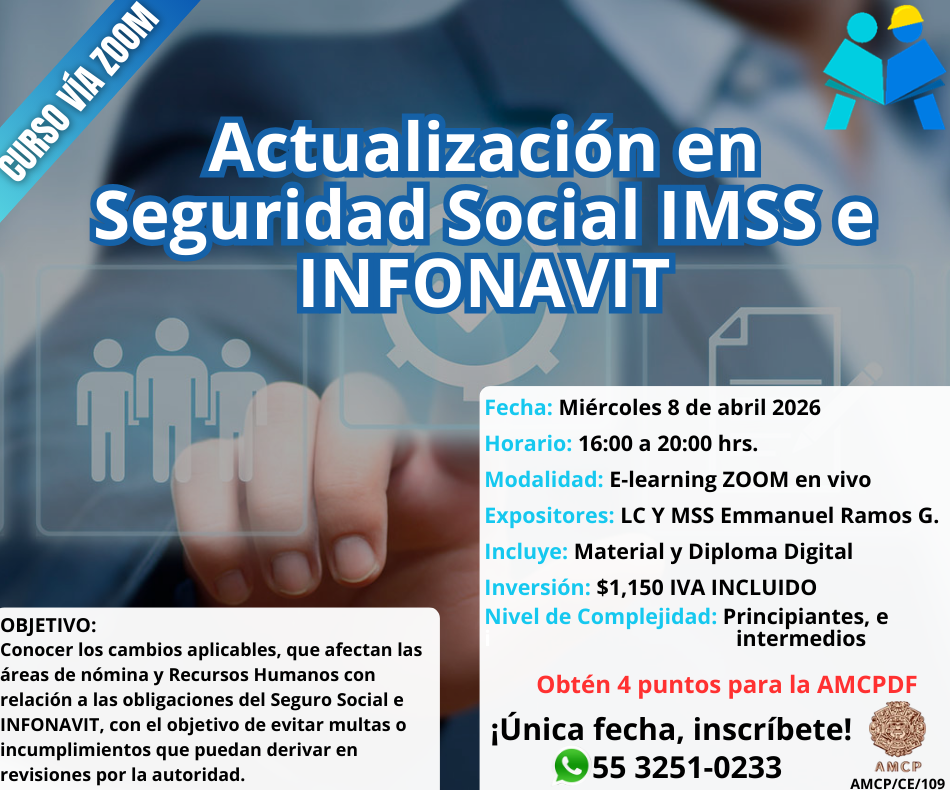 OBJETIVO: Dominar las plataformas digitales de Seguridad Social #IMSSDIGITAL en 2026 para realizar trámites, calcular y pagar correctamente las cuotas obrero-patronales, con control total, trazabilidad y cumplimiento en tiempo real ante IMSS e INFONAVIT. Al finalizar, el participante sabrá qué trámites gestionar desde el Escritorio Virtual IMSS, cómo operar el IDSE, utilizar el SUA para determinar cuotas, generar líneas de captura y pagos vía SIPARE, y gestionar trámites en el Portal Empresarial INFONAVIT, integrando la información sin errores ni duplicidades. Este curso convierte la tecnología en ventaja operativa: aprenderás flujos paso a paso, casos prácticos y buenas prácticas para reducir tiempos, evitar rechazos, prevenir diferencias y acreditar pagos correctamente.