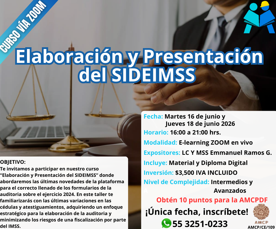 OBJETIVO: Te invitamos a participar en nuestro curso “Elaboración y Presentación del SIDEIMSS” donde abordaremos las últimas novedades de la plataforma para el correcto llenado de los formularios de la auditoria sobre el ejercicio 2025. En este taller te familiarizarás con las últimas variaciones en las cédulas y atestiguamientos, adquiriendo un enfoque estratégico para la elaboración de la auditoria y minimizando los riesgos de una fiscalización por parte del IMSS. Dirigido: A las Áreas de Auditoria, y en general a los Profesionistas que estén involucrados en la generación de información, revisión y llenado para elaborar el Dictamen de Seguridad Social SIDEIMSS.