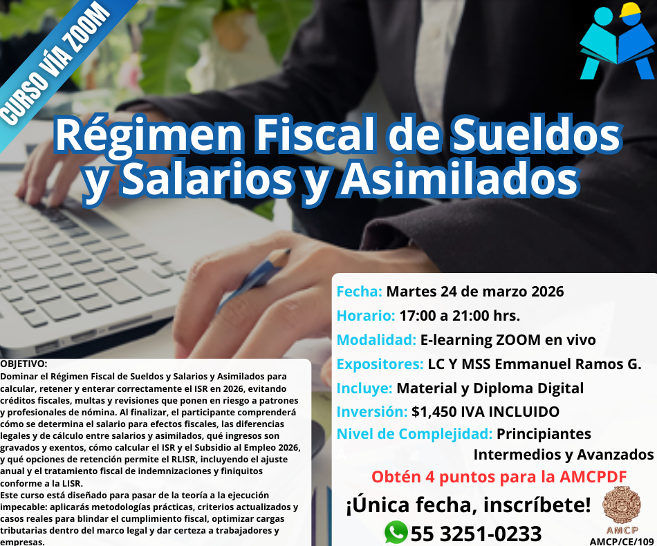 OBJETIVO: Dominar el Régimen Fiscal de Sueldos y Salarios y Asimilados para calcular, retener y enterar correctamente el ISR en 2026, evitando créditos fiscales, multas y revisiones que ponen en riesgo a patrones y profesionales de nómina. Al finalizar, el participante comprenderá cómo se determina el salario para efectos fiscales, las diferencias legales y de cálculo entre salarios y asimilados, qué ingresos son gravados y exentos, cómo calcular el ISR y el Subsidio al Empleo 2026, y qué opciones de retención permite el RLISR, incluyendo el ajuste anual y el tratamiento fiscal de indemnizaciones y finiquitos conforme a la LISR. Este curso está diseñado para pasar de la teoría a la ejecución impecable: aplicarás metodologías prácticas, criterios actualizados y casos reales para blindar el cumplimiento fiscal, optimizar cargas tributarias dentro del marco legal y dar certeza a trabajadores y empresas